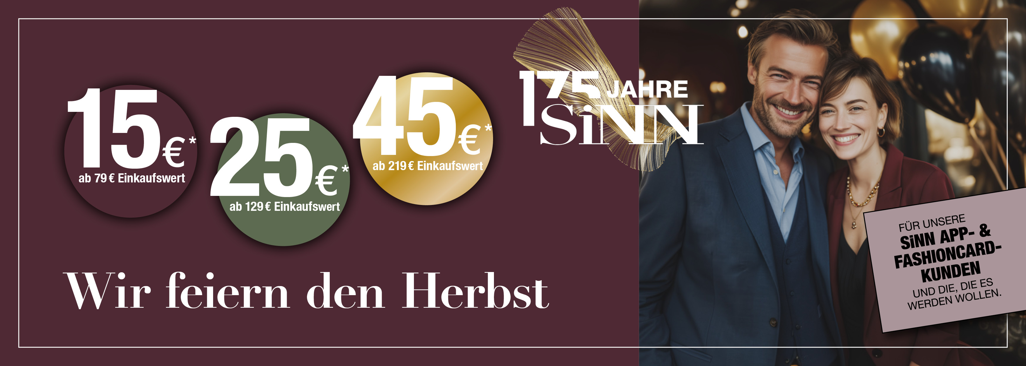 Exklusive Markenvielfalt und exzellente Beratung - dafür stehen Ihre SiNN-Modehäuser vor Ort. Egal ob Sie auf der Suche nach Damenbekleidung oder Herrenbekleidung sind – gemeinsam mit unseren Modeexperten finden Sie Ihr neues Lieblingsoutfit. Entdecken Sie auf unserer Homepage unsere aktuellen Aktionen, Preisvorteile und verkaufsoffenen Sonntage. Lassen Sie sich von den Trends der Saison inspirieren und entdecken Sie unsere große Markenauswahl. Exklusive Vorteile genießen Sie mit der SiNN APP. Neben Vorteilspreisen warten auch besondere Serviceleistungen und Features auf Sie, die Ihr Einkaufserlebnis noch komfortabler und erfolgreicher machen, der digitale Kassenbon zum Beispiel. Tolle Mode und Beratung kommen in Ihrem SiNN Modehaus zusammen, mit der Filialsuche finden Sie ganz einfach das Modehaus in Ihrer Nähe. Zusätzlich gibt es alle Infos rund um Ihr Lieblingshaus: Adresse, Kontaktmöglichkeiten und verfügbare Marken. Trends & Tradition passen gut zusammen. Alle Fakten, die Geschichte und Philosophie des Unternehmens SiNN GmbH stellen wir Ihnen unter dem Punkt „Unternehmen“ vor. Ihr Herz schlägt für Mensch & Mode? Dann finden Sie als Teil unseres Teams Gleichgesinnte und auf unserer Karriere-Seite viele attraktive Stellenangebote – ganz gleich, ob Sie einen Ausbildungsplatz oder einen Direkteinstieg suchen.