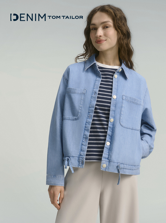 Denim in soften Tönen: Die helle Jacke, das Streifenshirt und die beige Denim-Hose schaffen einen harmonischen Look mit moderner Ausstrahlung. Lässig, klar und zeitgemäß interpretiert.
