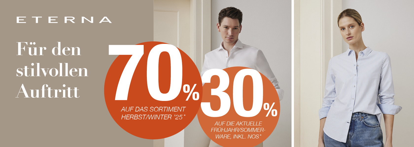 Ab sofort profitieren Sie von 70 % Preisvorteil auf das Herbst-/Wintersortiment von ETERNA sowie von 30 % Preisvorteil auf die aktuelle Frühjahr/Sommer Kollektion von ETERNA! *