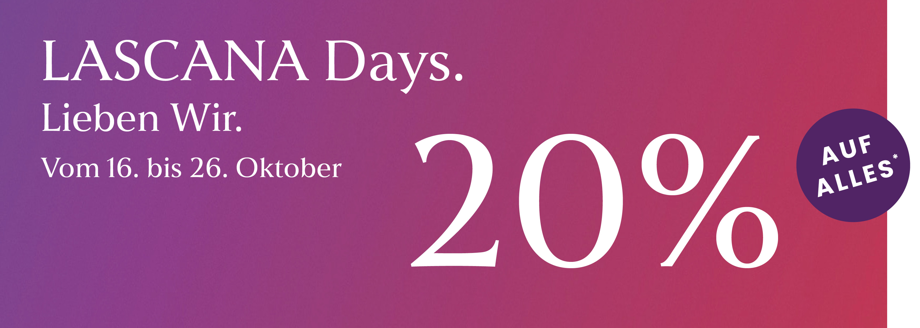 *Gültig vom 16.10.-26.10.2025 auf das gesamte LASCANA Sortiment. Ausgeschlossen sind reduzierte Artikel. Nicht mit anderen Rabattarten kombinierbar. Gilt nicht in Outlets.